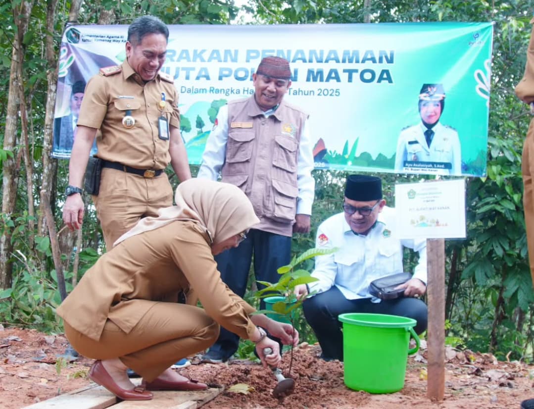 WAY KANAN – Pelaksana Tugas (Plt.) Bupati Way Kanan, Ayu Asalasiyah, S.Ked menghadiri Acara Penanaman Sejuta Pohon Matoa Serentak Dalam Rangka Peringatan Hari Bumi Sedunia Tahun 2025 di Kantor Kemenag Kabupaten Way Kanan, KM. 03 Kecamatan Blambangan Umpu, Selasa (22/04/2025).