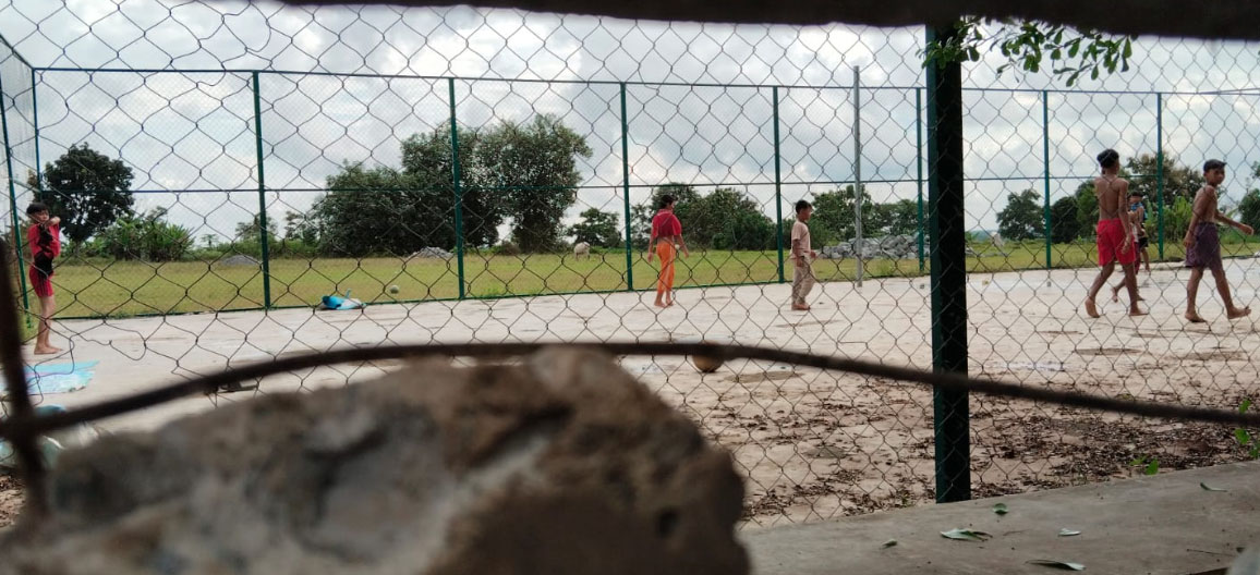 Antusias anak-anak ditengah terik matahari bermain bola meskipun ditembok keliling.